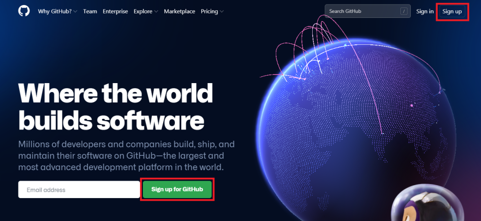 먼저, 아래 링크로 Github 사이트에 접속한다.오른쪽 상단 혹은 중앙 하단의 Sign up 버튼을 클릭한다.