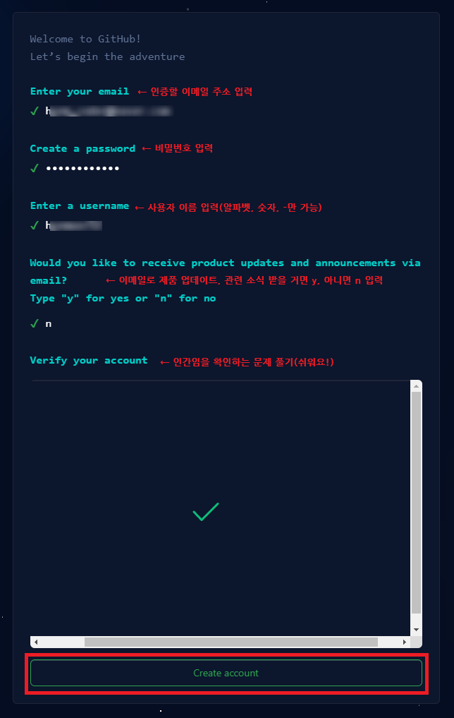 순서대로 이메일 주소, 비밀번호, 사용자 이름(ID) 등을 입력하고 continue 누른 뒤 마지막 문제까지 풀고 Create account 를 클릭한다.